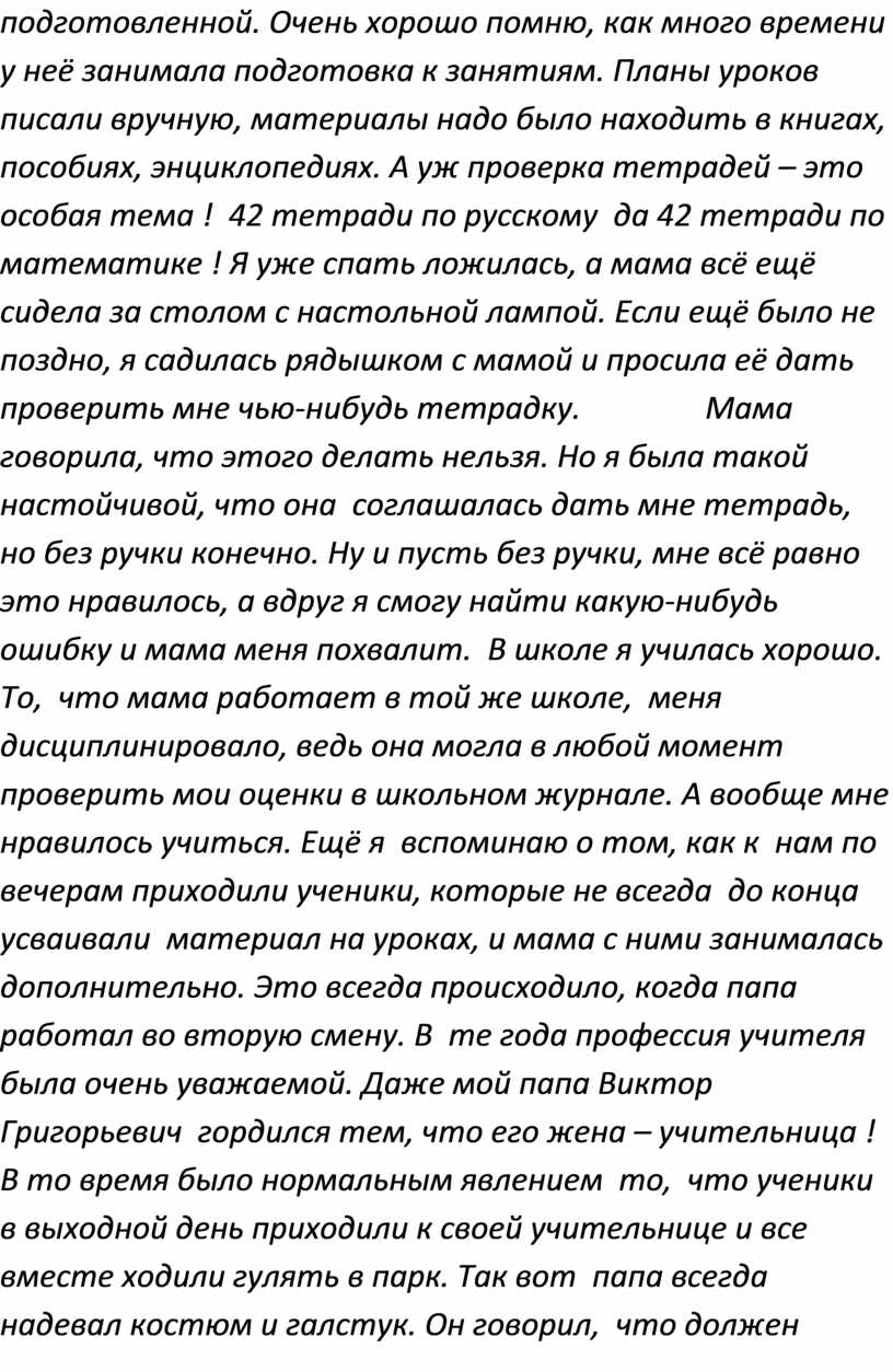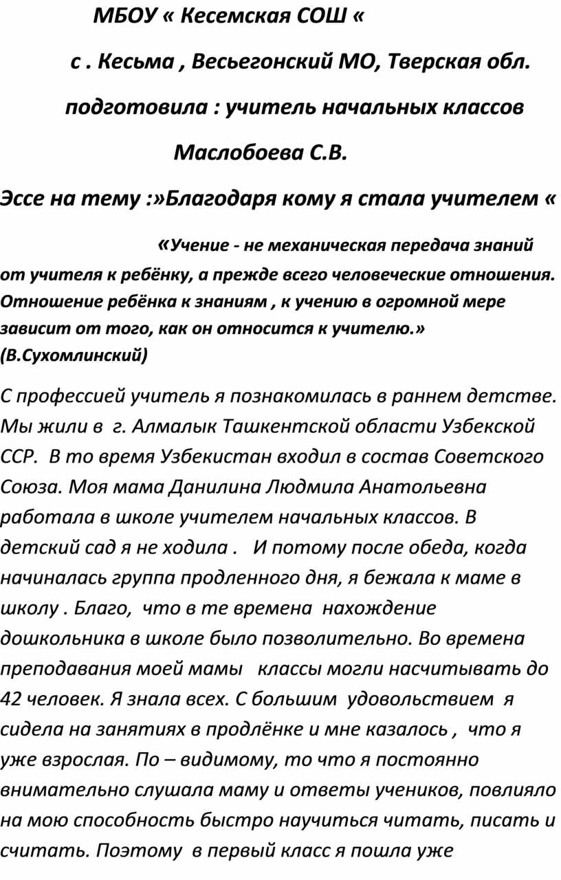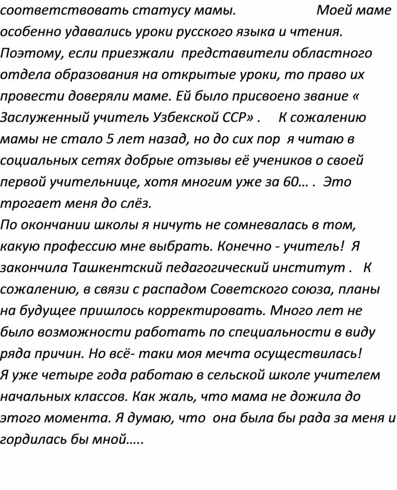 С профессией учитель я познакомилась в раннем детстве. Мы жили в г. Алмалык Ташкентской области Узбекской ССР. В то время Узбекистан входил в состав Советского Союза. Моя мама Данилина Людмила Анатольевна работала в школе учителем начальных классов. В детский сад я не ходила . И потому после обеда, когда начиналась группа продленного дня, я бежала к маме в школу . Благо, что в те времена нахождение дошкольника в школе было позволительно. Во времена преподавания моей мамы классы могли насчитывать до 42 человек. Я знала всех. С большим удовольствием я сидела на занятиях в продлёнке и мне казалось , что я уже взрослая. По – видимому, то что я постоянно внимательно слушала маму и ответы учеников, повлияло на мою способность быстро научиться читать, писать и считать. Поэтому в первый класс я пошла уже подготовленной. Очень хорошо помню, как много времени у неё занимала подготовка к занятиям. Планы уроков писали вручную, материалы надо было находить в книгах, пособиях, энциклопедиях. А уж проверка тетрадей – это особая тема ! 42 тетради по русскому да 42 тетради по математике ! Я уже спать ложилась, а мама всё ещё сидела за столом с настольной лампой. Если ещё было не поздно, я садилась рядышком с мамой и просила её дать проверить мне чью-нибудь тетрадку. Мама говорила, что этого делать нельзя. Но я была такой настойчивой, что она соглашалась дать мне тетрадь, но без ручки конечно. Ну и пусть без ручки, мне всё равно это нравилось, а вдруг я смогу найти какую-нибудь ошибку и мама меня похвалит. В школе я училась хорошо. То, что мама работает в той же школе, меня дисциплинировало, ведь она могла в любой момент проверить мои оценки в школьном журнале. А вообще мне нравилось учиться. Ещё я вспоминаю о том, как к нам по вечерам приходили ученики, которые не всегда до конца усваивали материал на уроках, и мама с ними занималась дополнительно. Это всегда происходило, когда папа работал во вторую смену. В те года профессия учителя была очень уважаемой. Даже мой папа Виктор Григорьевич гордился тем, что его жена – учительница ! В то время было нормальным явлением то, что ученики в выходной день приходили к своей учительнице и все вместе ходили гулять в парк. Так вот папа всегда надевал костюм и галстук. Он говорил, что должен соответствовать статусу мамы. Моей маме особенно удавались уроки русского языка и чтения. Поэтому, если приезжали представители областного отдела образования на открытые уроки, то право их провести доверяли маме. Ей было присвоено звание « Заслуженный учитель Узбекской ССР» . К сожалению мамы не стало 5 лет назад, но до сих пор я читаю в социальных сетях добрые отзывы её учеников о своей первой учительнице, хотя многим уже за 60… . Это трогает меня до слёз. По окончании школы я ничуть не сомневалась в том, какую профессию мне выбрать. Конечно - учитель! Я закончила Ташкентский педагогический институт . К сожалению, в связи с распадом Советского союза, планы на будущее пришлось корректировать. Много лет не было возможности работать по специальности в виду ряда причин. Но всё- таки моя мечта осуществилась! Я уже четыре года работаю в сельской школе учителем начальных классов. Как жаль, что мама не дожила до этого момента. Я думаю, что она была бы рада за меня и гордилась бы мной…..