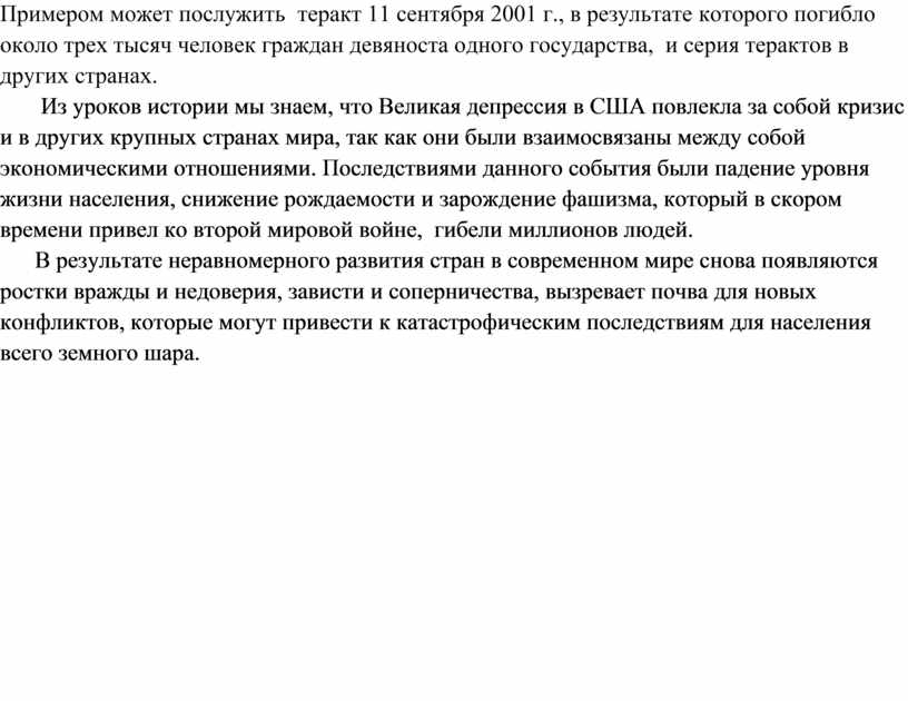 В результате неравномерного развития стран в современном мире снова появляются ростки вражды и недоверия, зависти и соперничества, вызревает почва для новых конфликтов, которые могут привести к катастрофическим последствиям для населения всего земного шара.