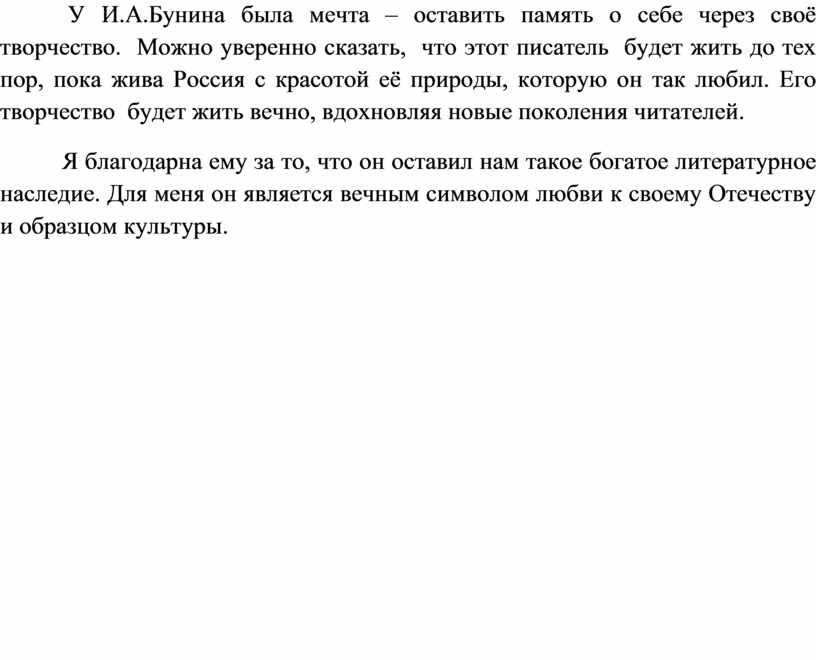 У И.А.Бунина была мечта – оставить память о себе через своё творчество. Можно уверенно сказать, что этот писатель будет жить до тех пор, пока жива Россия с красотой её природы, которую он так любил. Его творчество будет жить вечно, вдохновляя новые поколения читателей.