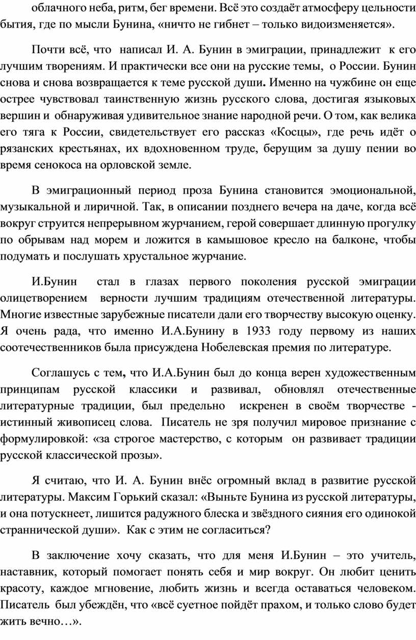 Более чем шестидесятилетний путь Бунина в литературе можно разделить на две примерно равные части – дооктябрьскую и эмигрантскую. Соглашусь с тем мнением, что после катастрофических событий 1917 года писатель не мог не измениться, но всё же его творчество обладает высокой степенью цельности – редкое качество для русской литературы XX века. Это проявляется, например, в том, что в бунинских картинах природы всегда присутствуют дали земли, просторы звёздного, солнечного, лунного или облачного неба, ритм, бег времени. Всё это создаёт атмосферу цельности бытия, где по мысли Бунина, «ничто не гибнет – только видоизменяется».