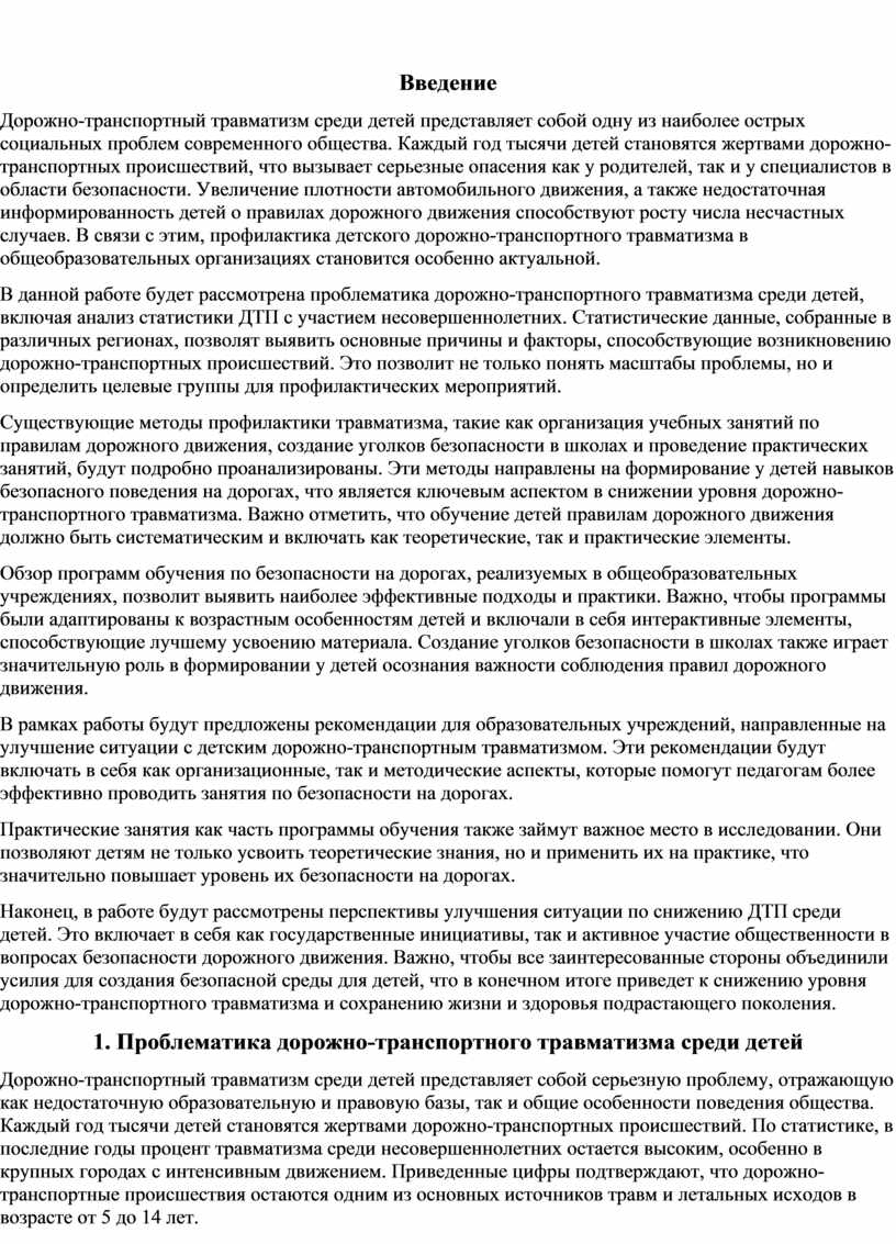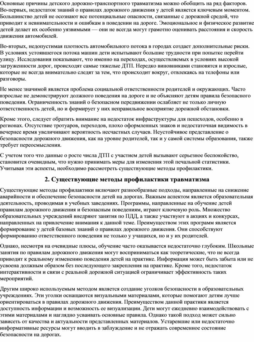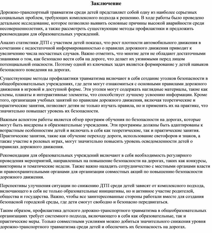 Дорожно-транспортный травматизм среди детей представляет собой одну из наиболее серьезных социальных проблем, требующих комплексного подхода к решению. В ходе работы было проведено детальное исследование, которое позволило выявить основные причины высокой аварийности среди несовершеннолетних, а также рассмотреть существующие методы профилактики и предложить рекомендации для образовательных учреждений.