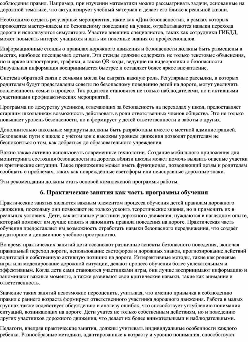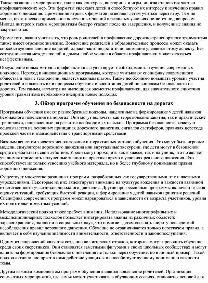 Важным аспектом работы является обзор программ обучения по безопасности на дорогах, которые могут быть внедрены в образовательные учреждения. Эти программы должны быть адаптированы к возрастным особенностям детей и включать в себя как теоретические, так и практические занятия. Практические занятия, такие как обучение переходу дороги, использование светофоров и знаков, а также участие в ролевых играх, могут значительно повысить уровень осведомленности детей о правилах дорожного движения.