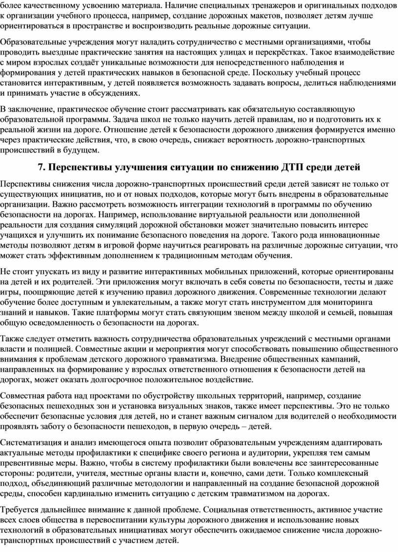 Наконец, в работе будут рассмотрены перспективы улучшения ситуации по снижению ДТП среди детей. Это включает в себя как государственные инициативы, так и активное участие общественности в вопросах безопасности дорожного движения. Важно, чтобы все заинтересованные стороны объединили усилия для создания безопасной среды для детей, что в конечном итоге приведет к снижению уровня дорожно-транспортного травматизма и сохранению жизни и здоровья подрастающего поколения.