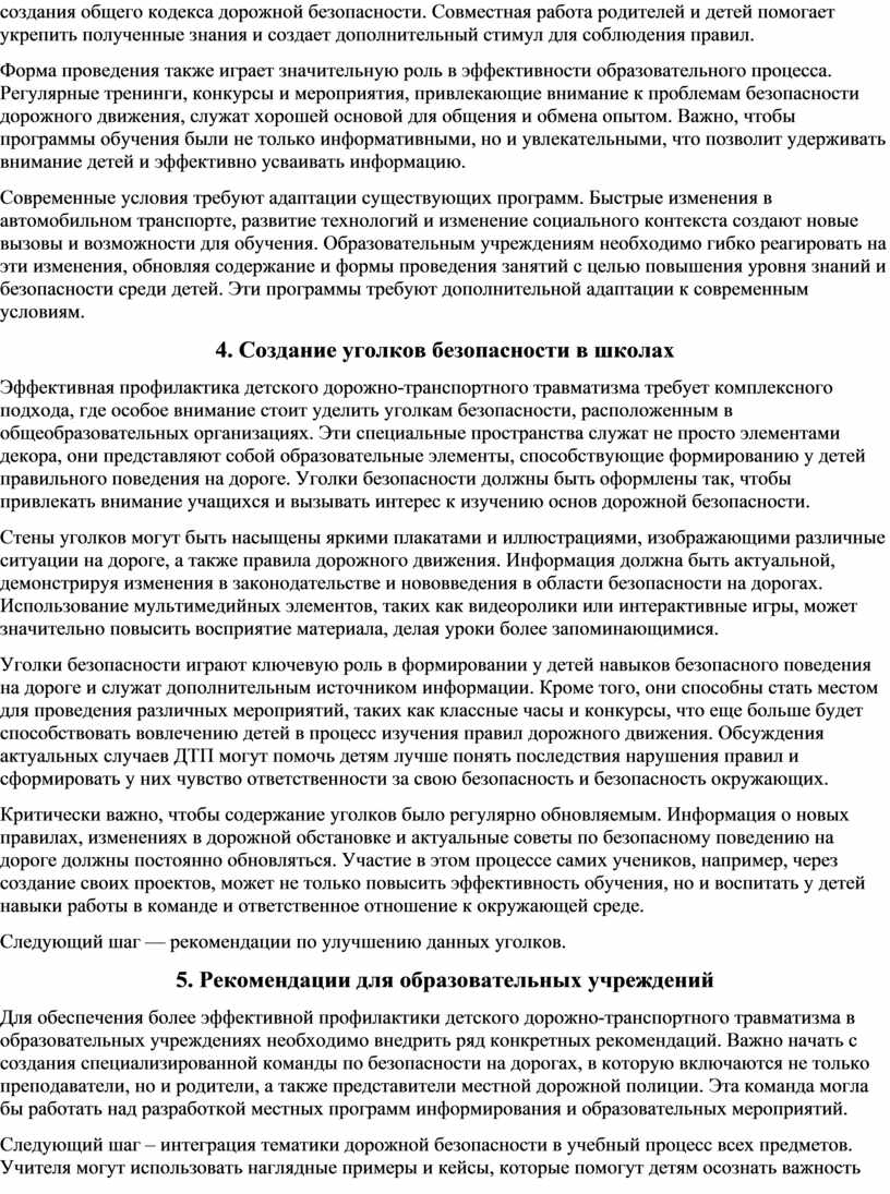 Таким образом, профилактика детского дорожно-транспортного травматизма в общеобразовательных организациях требует системного подхода, включающего в себя как образовательные, так и практические меры. Только совместными усилиями можно добиться значительного снижения уровня дорожно-транспортного травматизма среди детей и обеспечить их безопасность на дорогах.