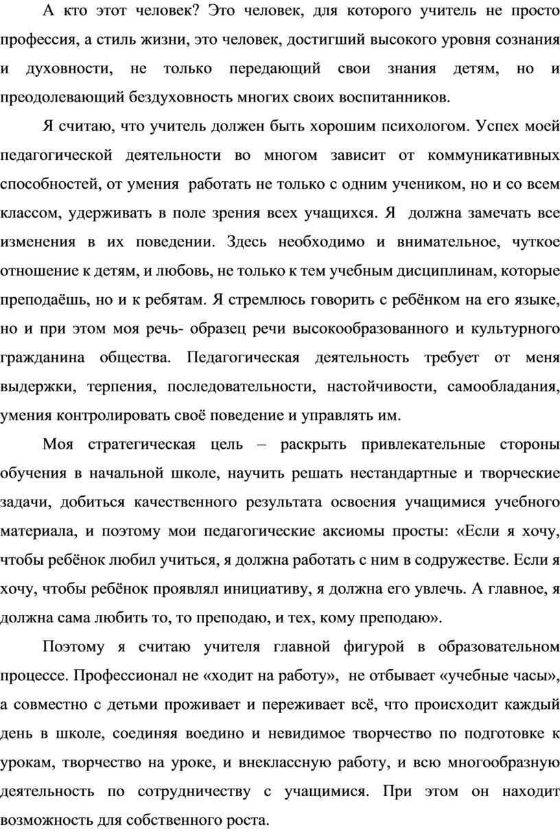 Я считаю, что учитель должен быть хорошим психологом. Успех моей педагогической деятельности во многом зависит от коммуникативных способностей, от умения работать не только с одним учеником, но и со всем классом, удерживать в поле зрения всех учащихся. Я должна замечать все изменения в их поведении. Здесь необходимо и внимательное, чуткое отношение к детям, и любовь, не только к тем учебным дисциплинам, которые преподаёшь, но и к ребятам. Я стремлюсь говорить с ребёнком на его языке, но и при этом моя речь- образец речи высокообразованного и культурного гражданина общества. Педагогическая деятельность требует от меня выдержки, терпения, последовательности, настойчивости, самообладания, умения контролировать своё поведение и управлять им.