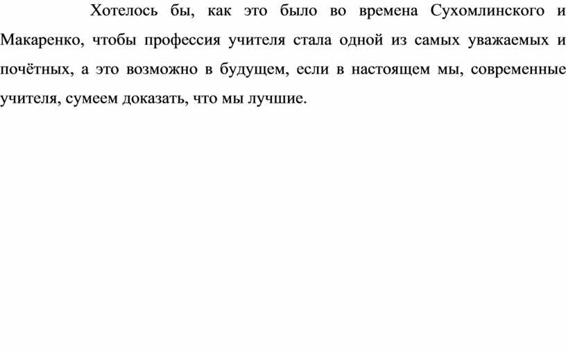 Хотелось бы, как это было во времена Сухомлинского и Макаренко, чтобы профессия учителя стала одной из самых уважаемых и почётных, а это возможно в будущем, если в настоящем мы, современные учителя, сумеем доказать, что мы лучшие.