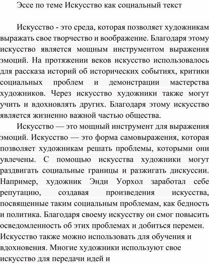 Искусство — это мощный инструмент для выражения эмоций. Искусство — это форма самовыражения, которая позволяет художникам решать проблемы, которыми они увлечены. С помощью искусства художники могут раздвигать социальные границы и разжигать дискуссии. Например, художник Энди Уорхол заработал себе репутацию, создавая произведения искусства, посвященные таким социальным проблемам, как бедность и политика. Благодаря своему искусству он смог повысить осведомленность об этих проблемах и добиться перемен.
