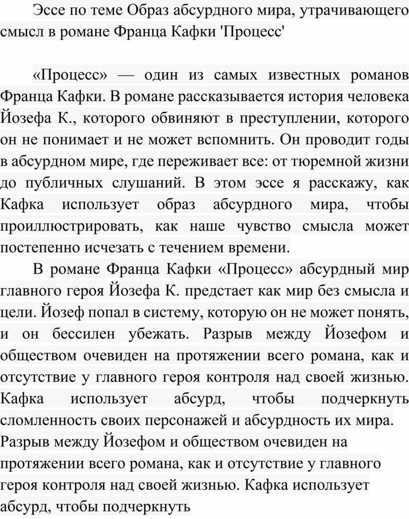 Эссе по теме Образ абсурдного мира, утрачивающего смысл в романе Франца Кафки 'Процесс'