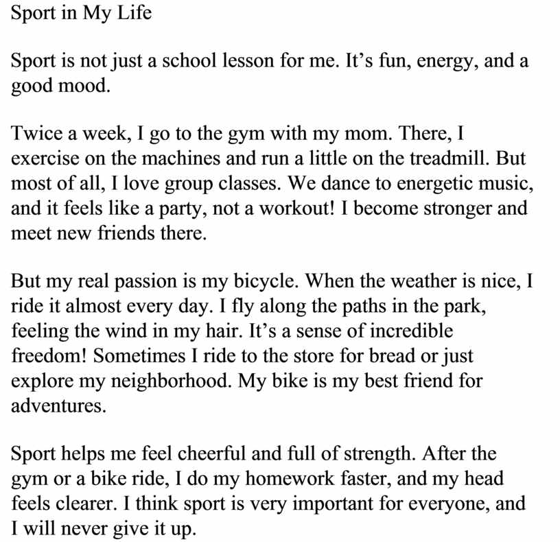 Sport helps me feel cheerful and full of strength. After the gym or a bike ride, I do my homework faster, and my head feels clearer. I think sport is very important for everyone, and I will never give it up.