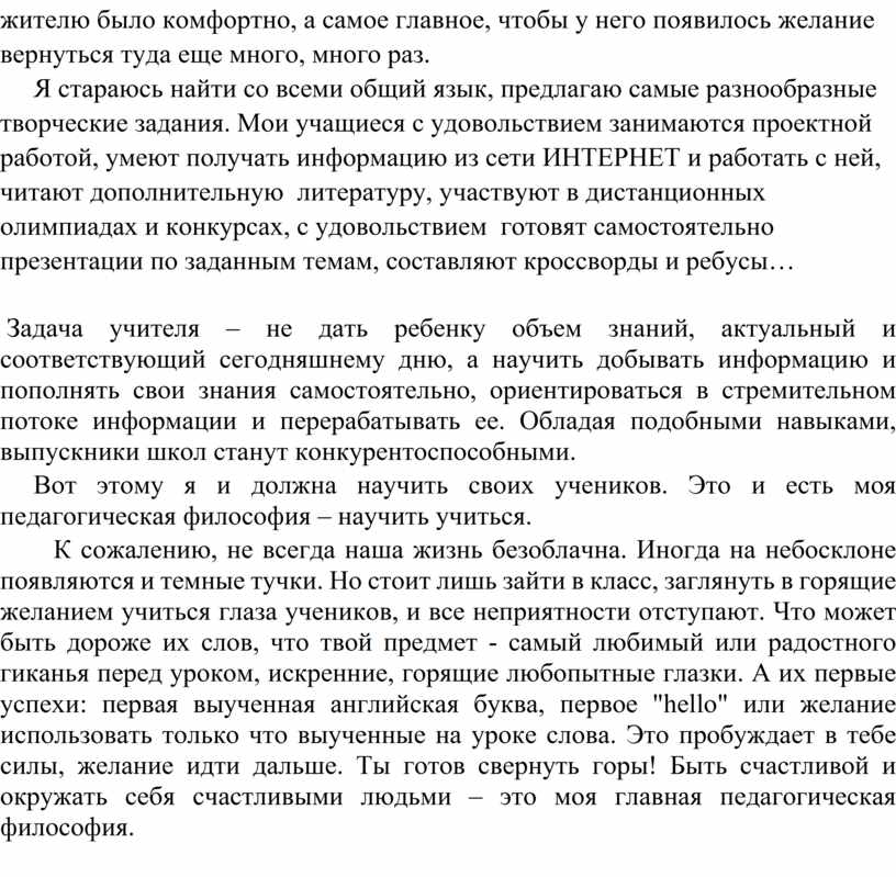 К сожалению, не всегда наша жизнь безоблачна. Иногда на небосклоне появляются и темные тучки. Но стоит лишь зайти в класс, заглянуть в горящие желанием учиться глаза учеников, и все неприятности отступают. Что может быть дороже их слов, что твой предмет - самый любимый или радостного гиканья перед уроком, искренние, горящие любопытные глазки. А их первые успехи: первая выученная английская буква, первое "hello" или желание использовать только что выученные на уроке слова. Это пробуждает в тебе силы, желание идти дальше. Ты готов свернуть горы! Быть счастливой и окружать себя счастливыми людьми – это моя главная педагогическая философия.