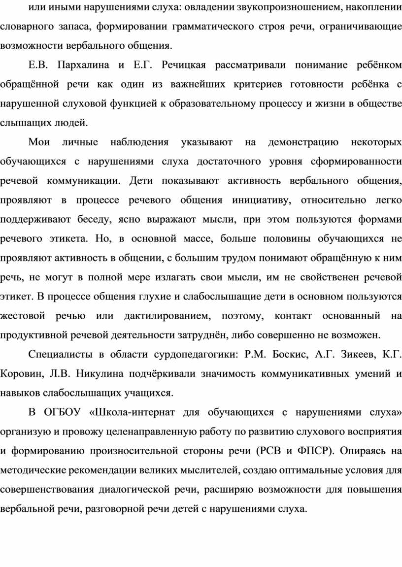 В исследованиях сурдопедагогов: Т.А. Зыковой, А.Г. Зикеева, Б.Д. Корсунской рассматривались основные проблемы речевого развития детей с теми или иными нарушениями слуха: овладении звукопроизношением, накоплении словарного запаса, формировании грамматического строя речи, ограничивающие возможности вербального общения.