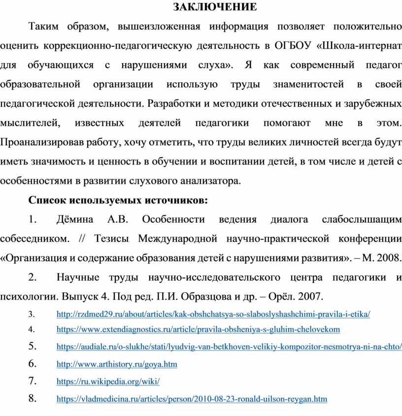 Таким образом, вышеизложенная информация позволяет положительно оценить коррекционно-педагогическую деятельность в ОГБОУ «Школа-интернат для обучающихся с нарушениями слуха». Я как современный педагог образовательной организации использую труды знаменитостей в своей педагогической деятельности. Разработки и методики отечественных и зарубежных мыслителей, известных деятелей педагогики помогают мне в этом. Проанализировав работу, хочу отметить, что труды великих личностей всегда будут иметь значимость и ценность в обучении и воспитании детей, в том числе и детей с особенностями в развитии слухового анализатора.