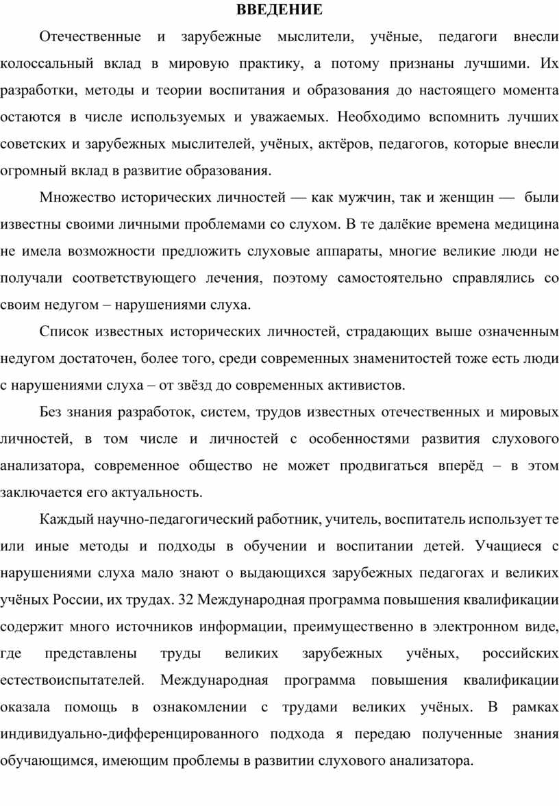 Каждый научно-педагогический работник, учитель, воспитатель использует те или иные методы и подходы в обучении и воспитании детей. Учащиеся с нарушениями слуха мало знают о выдающихся зарубежных педагогах и великих учёных России, их трудах. 32 Международная программа повышения квалификации содержит много источников информации, преимущественно в электронном виде, где представлены труды великих зарубежных учёных, российских естествоиспытателей. Международная программа повышения квалификации оказала помощь в ознакомлении с трудами великих учёных. В рамках индивидуально-дифференцированного подхода я передаю полученные знания обучающимся, имеющим проблемы в развитии слухового анализатора.