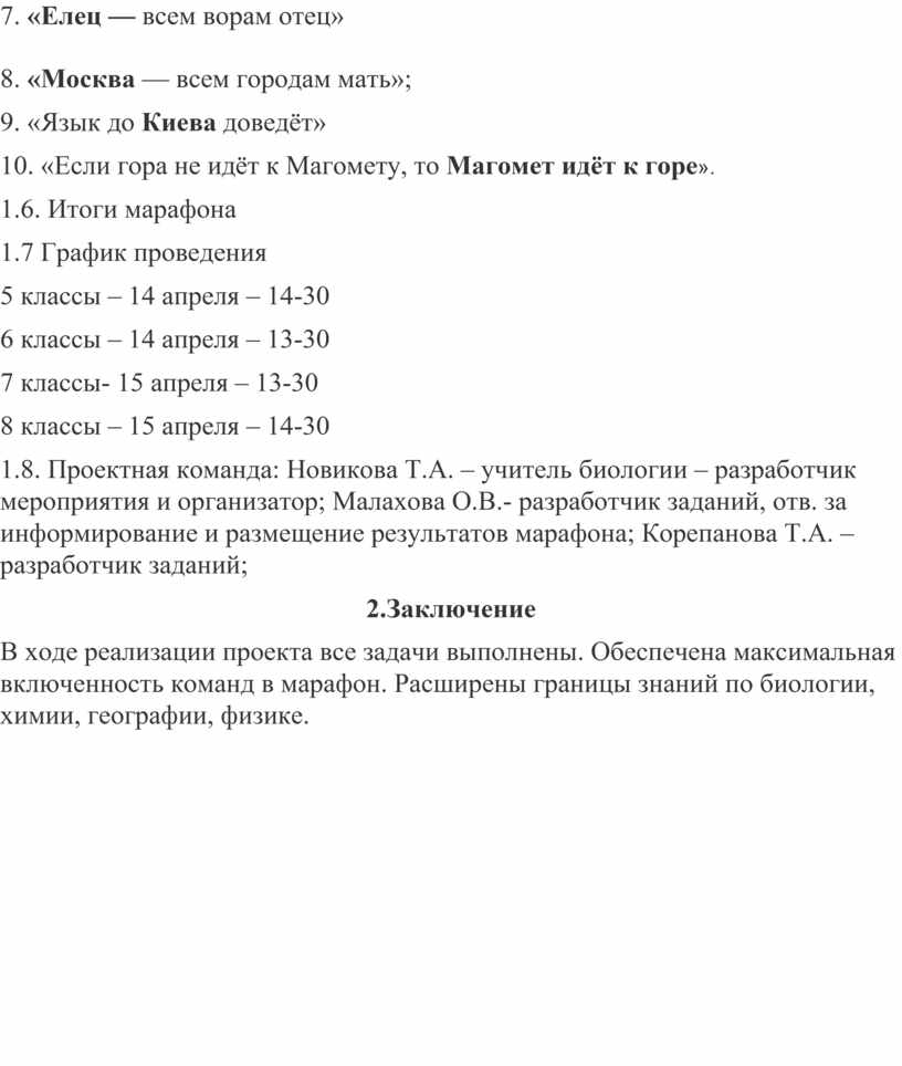 1.8. Проектная команда: Новикова Т.А. – учитель биологии – разработчик мероприятия и организатор; Малахова О.В.- разработчик заданий, отв. за информирование и размещение результатов марафона; Корепанова Т.А. – разработчик заданий;