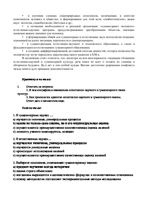 Материал для обучения в высших учебных заведениях по курсу "Концепции современного естествознания" и "Естественно-научная картина мира" для студентов-очников гуманитарных факультетов. Тема №1 "Естественно-научная и гуманитарная культуры" с практикумом и кратким тестом для проверки полученных знаний (в тестах выделены жирным шрифтом правильные ответы).