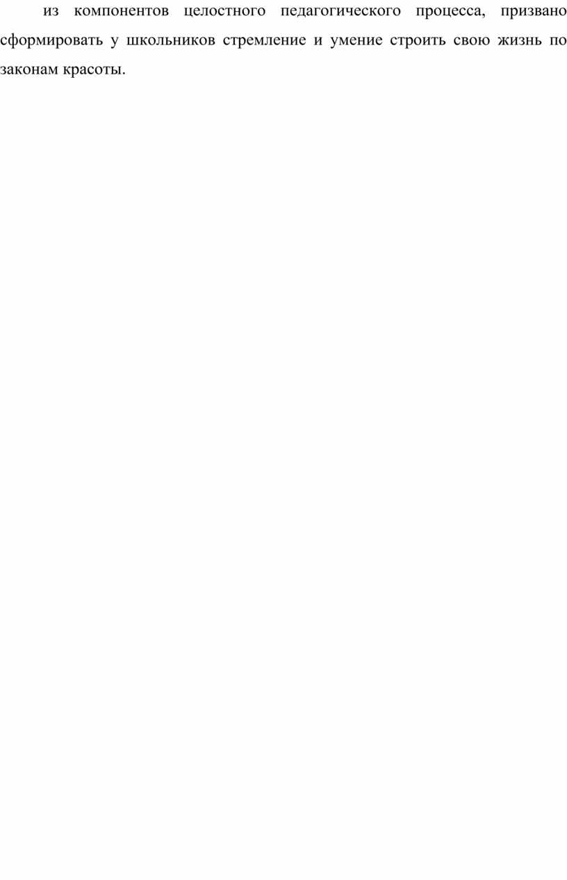 Таким образом, научное осмысление эстетического воспитания проходило сложный путь в различных исторических условиях. Большинство педагогов сходится во мнении, что эстетическое воспитание, являясь одним из компонентов целостного педагогического процесса, призвано сформировать у школьников стремление и умение строить свою жизнь по законам красоты.