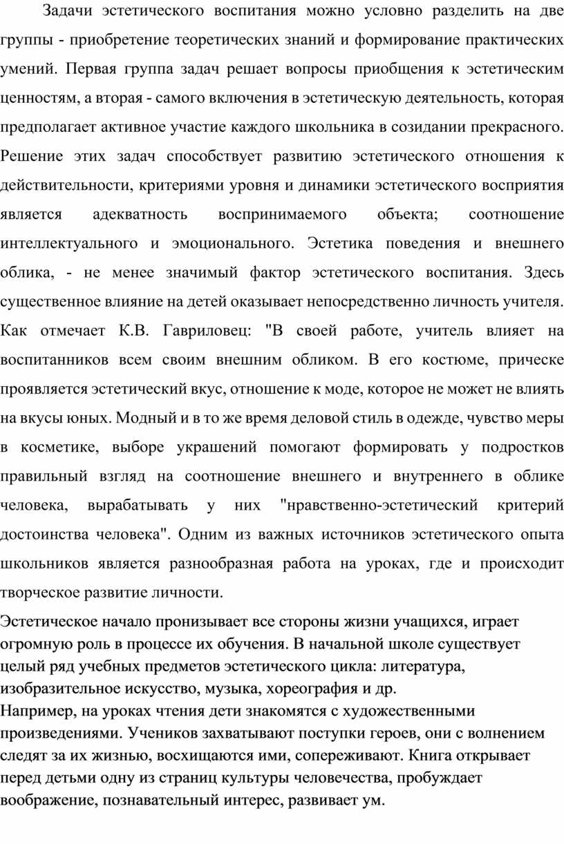 Задачи эстетического воспитания можно условно разделить на две группы - приобретение теоретических знаний и формирование практических умений. Первая группа задач решает вопросы приобщения к эстетическим ценностям, а вторая - самого включения в эстетическую деятельность, которая предполагает активное участие каждого школьника в созидании прекрасного. Решение этих задач способствует развитию эстетического отношения к действительности, критериями уровня и динамики эстетического восприятия является адекватность воспринимаемого объекта; соотношение интеллектуального и эмоционального. Эстетика поведения и внешнего облика, - не менее значимый фактор эстетического воспитания. Здесь существенное влияние на детей оказывает непосредственно личность учителя. Как отмечает К.В. Гавриловец: "В своей работе, учитель влияет на воспитанников всем своим внешним обликом. В его костюме, прическе проявляется эстетический вкус, отношение к моде, которое не может не влиять на вкусы юных. Модный и в то же время деловой стиль в одежде, чувство меры в косметике, выборе украшений помогают формировать у подростков правильный взгляд на соотношение внешнего и внутреннего в облике человека, вырабатывать у них "нравственно-эстетический критерий достоинства человека". Одним из важных источников эстетического опыта школьников является разнообразная работа на уроках, где и происходит творческое развитие личности.