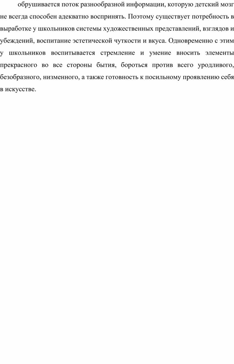 Несомненно, развивать способности личности к полноценному восприятию и правильному пониманию прекрасного в искусстве и действительности необходимо уже в раннем возрасте. В настоящее время этот вопрос особенно актуален, так как на школьников ежедневно обрушивается поток разнообразной информации, которую детский мозг не всегда способен адекватно воспринять. Поэтому существует потребность в выработке у школьников системы художественных представлений, взглядов и убеждений, воспитание эстетической чуткости и вкуса. Одновременно с этим у школьников воспитывается стремление и умение вносить элементы прекрасного во все стороны бытия, бороться против всего уродливого, безобразного, низменного, а также готовность к посильному проявлению себя в искусстве.
