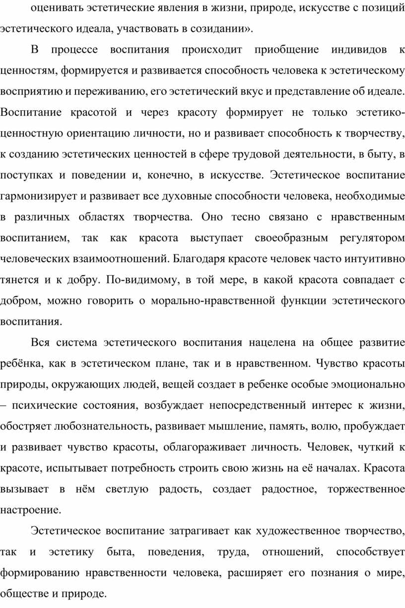 Эстетическое воспитание - это процесс формирования и развития эстетического эмоционально-чувственного и ценностного сознания личности и соответствующей ему деятельности. Оно реализуется и приобретает ценность при самообразовании, саморазвитии личности.