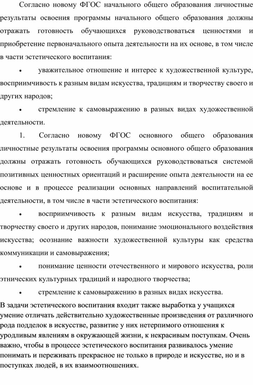 1. Согласно новому ФГОС основного общего образования личностные результаты освоения программы основного общего образования должны отражать готовность обучающихся руководствоваться системой позитивных ценностных ориентаций и расширение опыта деятельности на ее основе и в процессе реализации основных направлений воспитательной деятельности, в том числе в части эстетического воспитания: