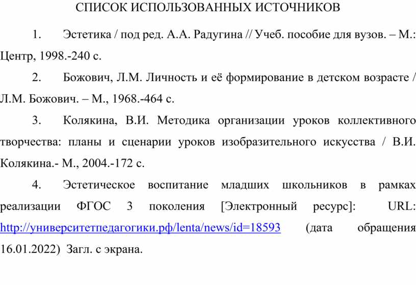 4. Эстетическое воспитание младших школьников в рамках реализации ФГОС 3 поколения [Электронный ресурс]: URL: http://университетпедагогики.рф/lenta/news/id=18593 (дата обращения 16.01.2022) Загл. с экрана.