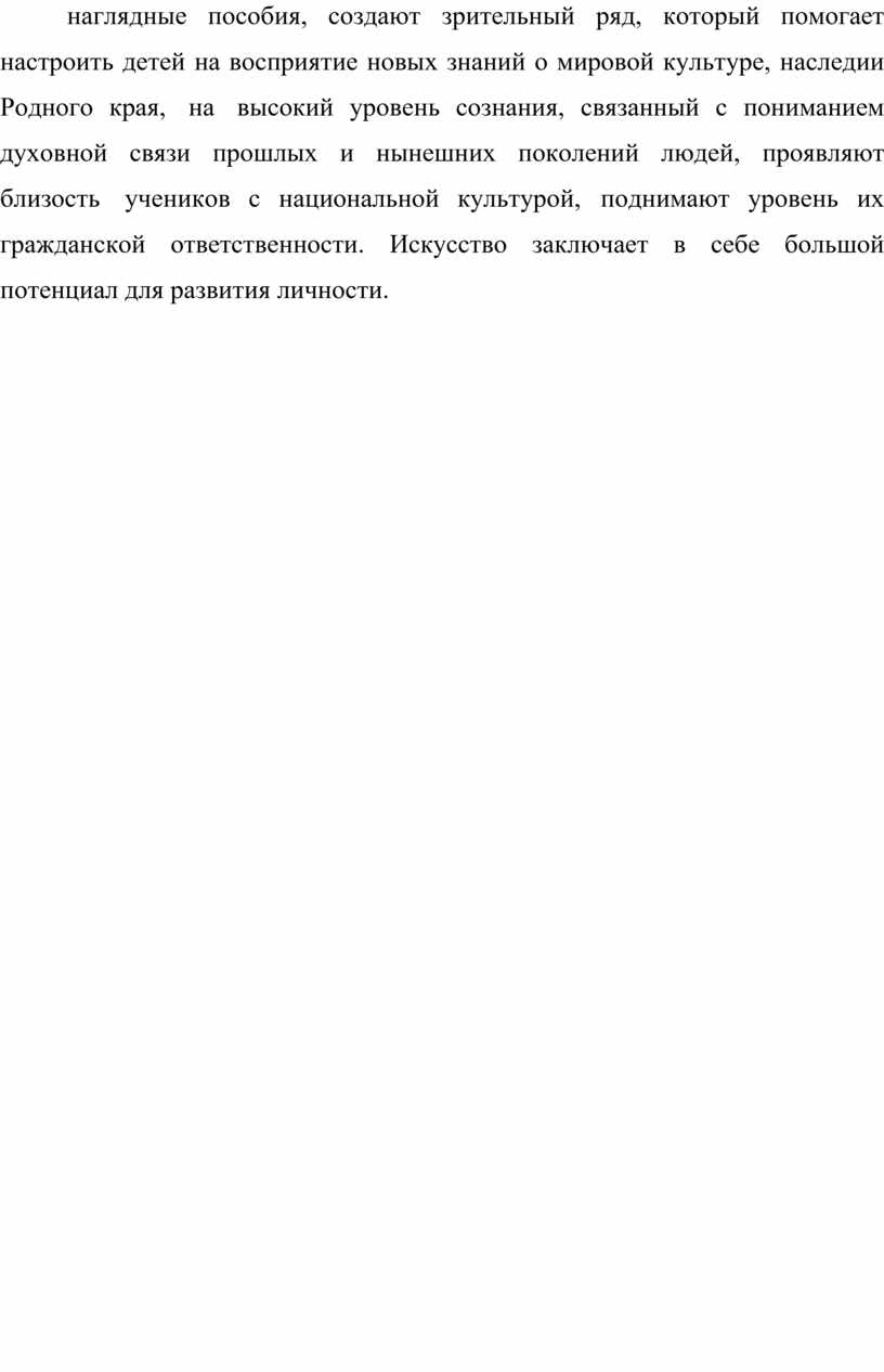 Эстетическое воспитание школьников непростая, но очень важна задача, которую ставит перед учителями ФГОС. На уроках изобразительного искусства выполнить эту задачу поможет, наряду с прочими способами, правильный выбор и применение наглядных пособий. Ведь именно наглядные пособия, создают зрительный ряд, который помогает настроить детей на восприятие новых знаний о мировой культуре, наследии Родного края, на высокий уровень сознания, связанный с пониманием духовной связи прошлых и нынешних поколений людей, проявляют близость учеников с национальной культурой, поднимают уровень их гражданской ответственности. Искусство заключает в себе большой потенциал для развития личности.