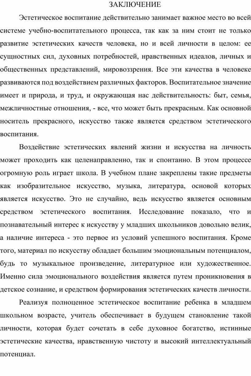 Реализуя полноценное эстетическое воспитание ребенка в младшем школьном возрасте, учитель обеспечивает в будущем становление такой личности, которая будет сочетать в себе духовное богатство, истинные эстетические качества, нравственную чистоту и высокий интеллектуальный потенциал.
