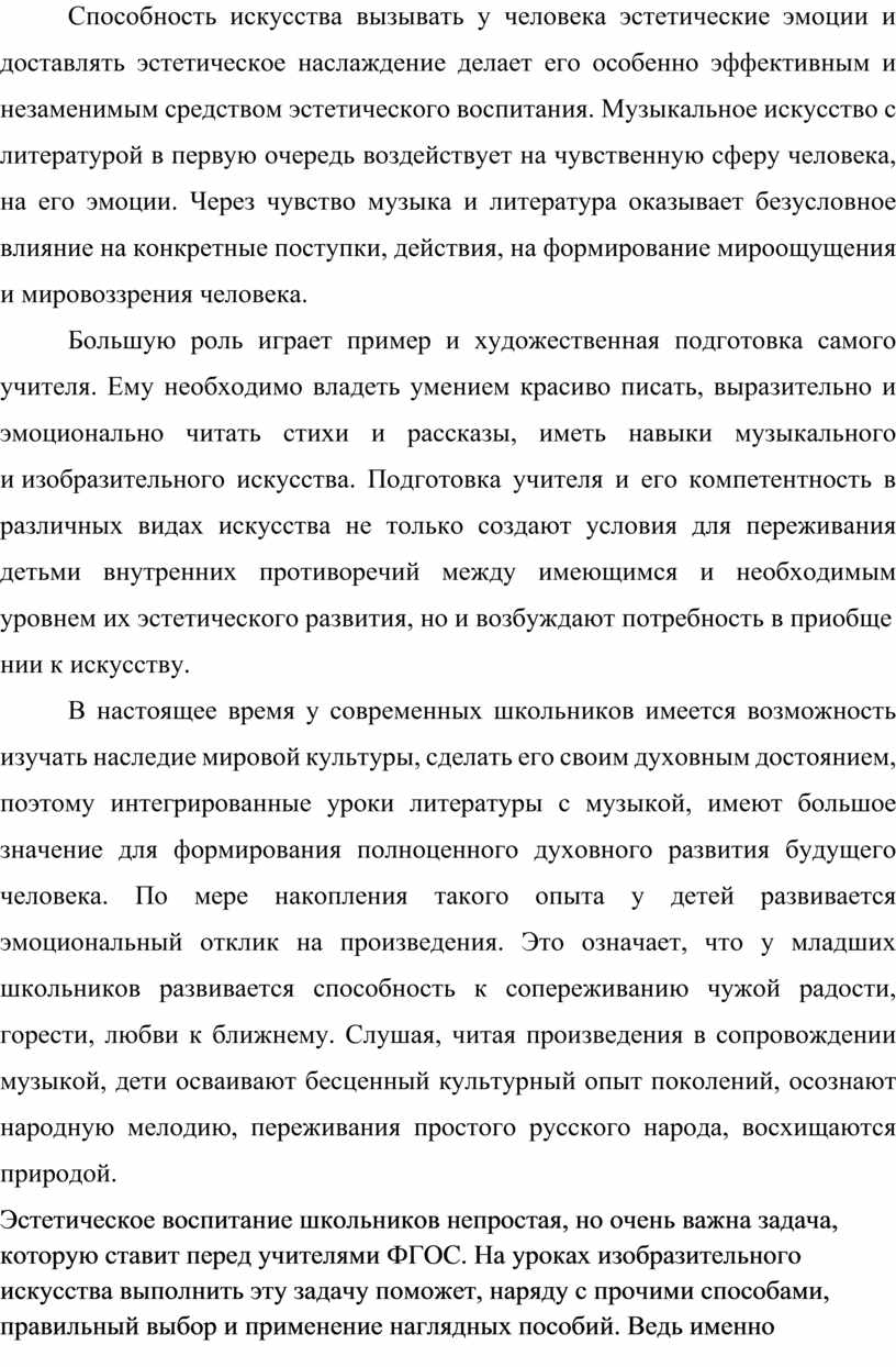 В настоящее время у современных школьников имеется возможность изучать наследие мировой культуры, сделать его своим духовным достоянием, поэтому интегрированные уроки литературы с музыкой, имеют большое значение для формирования полноценного духовного развития будущего человека. По мере накопления такого опыта у детей развивается эмоциональный отклик на произведения. Это означает, что у младших школьников развивается способность к сопереживанию чужой радости, горести, любви к ближнему. Слушая, читая произведения в сопровождении музыкой, дети осваивают бесценный культурный опыт поколений, осознают народную мелодию, переживания простого русского народа, восхищаются природой.