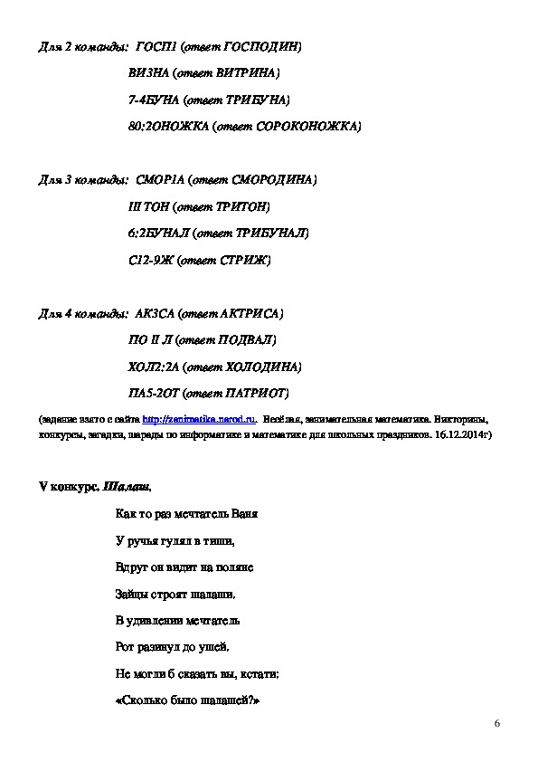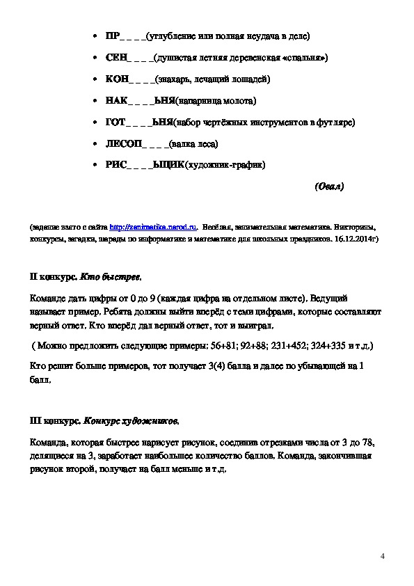 конкурсы, загадки, шарады по информатике и математике для школьных праздников. 16.12.2014г)