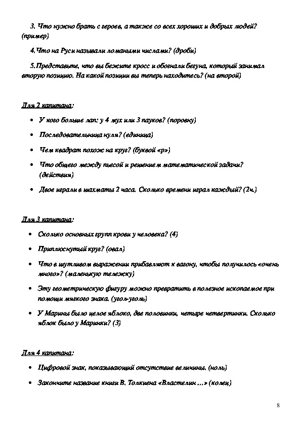 Задать каждому капитану по 5 вопросов из разных областей знаний: русского языка,
