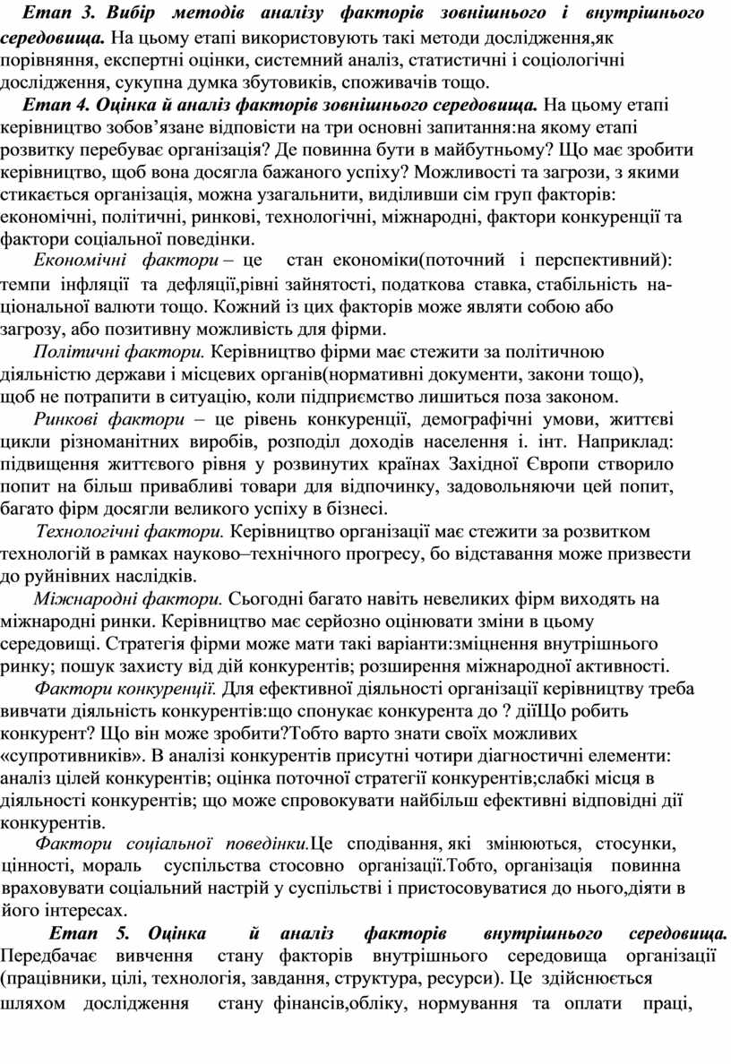 керівництво зобов’язане відповісти на три основні запитання:на якому етапі розвитку перебуває організація? Де повинна бути в майбутньому? Що має зробити керівництво, щоб вона досягла бажаного успіху? Можливості та загрози, з якими стикається організація, можна узагальнити, виділивши сім груп факторів: економічні, політичні, ринкові, технологічні, міжнародні, фактори конкуренції та фактори соціальної поведінки.