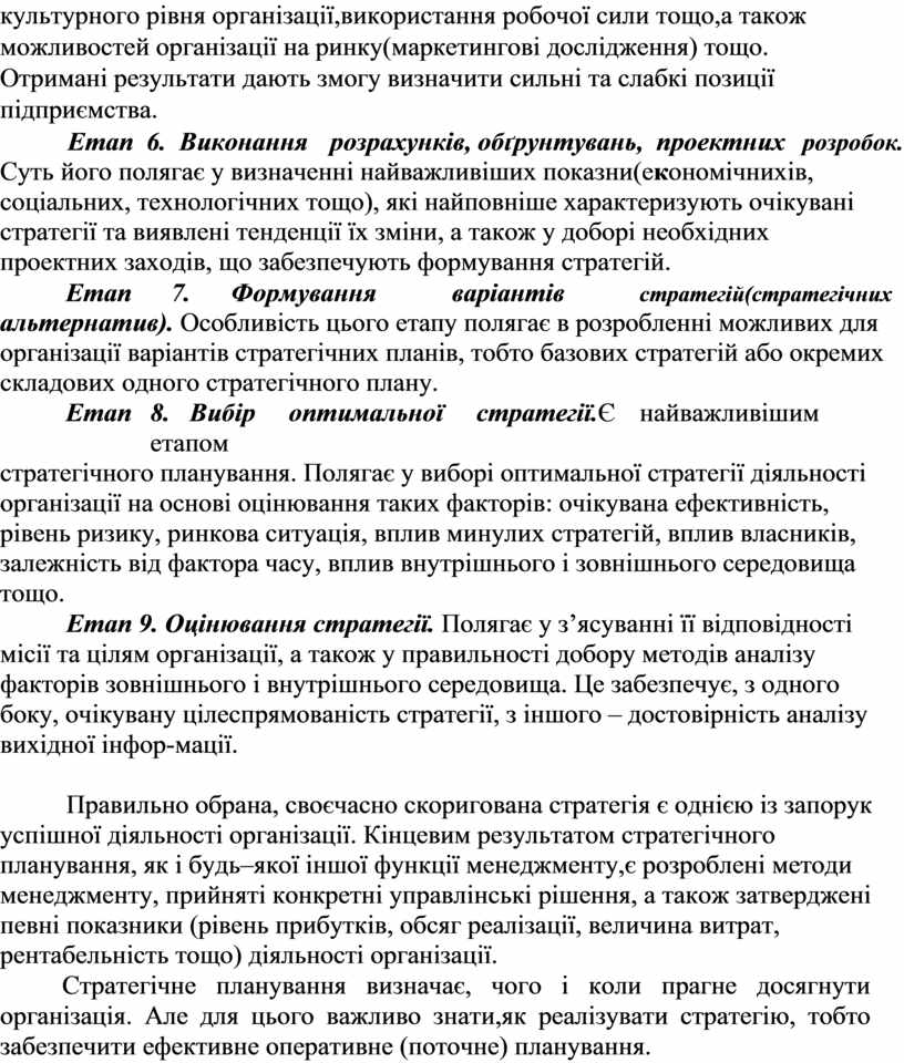 Етап 9. Оцінювання стратегії. Полягає у з’ясуванні її відповідності місії та цілям організації, а також у правильності добору методів аналізу факторів зовнішнього і внутрішнього середовища. Це забезпечує, з одного боку, очікувану цілеспрямованість стратегії, з іншого – достовірність аналізу вихідної інфор-мації.