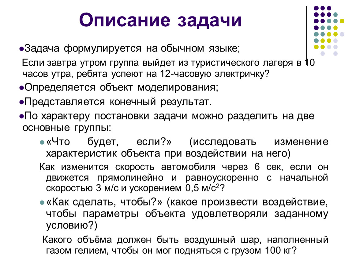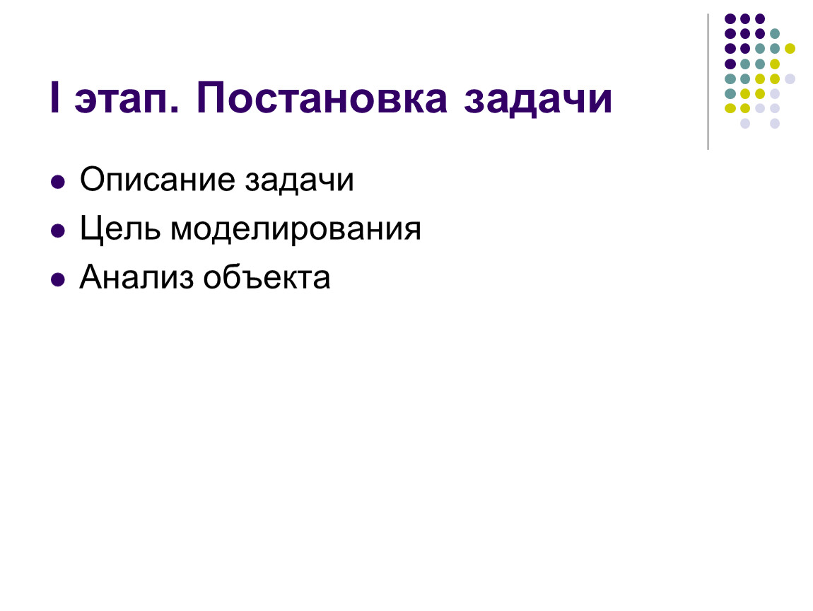 Выделяются объекты моделирования и дается их развернутое содержательное описание (природа объектов, их зависимости, связи, свойства, характеристики);