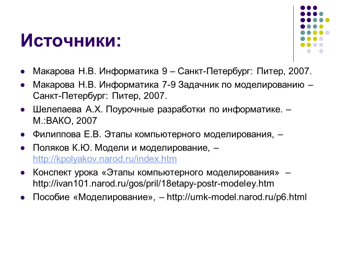 Конспект урока «Этапы компьютерного моделирования» –http://ivan101.narod.ru/gos/pril/18etapy-postr-modeley.htm