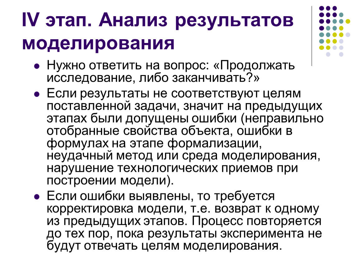 Если результаты не соответствуют целям поставленной задачи, значит на предыдущих этапах были допущены ошибки (неправильно отобранные свойства объекта, ошибки в формулах на этапе формализации, неудачный метод или среда моделирования, нарушение технологических приемов при построении модели).