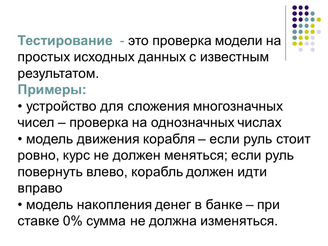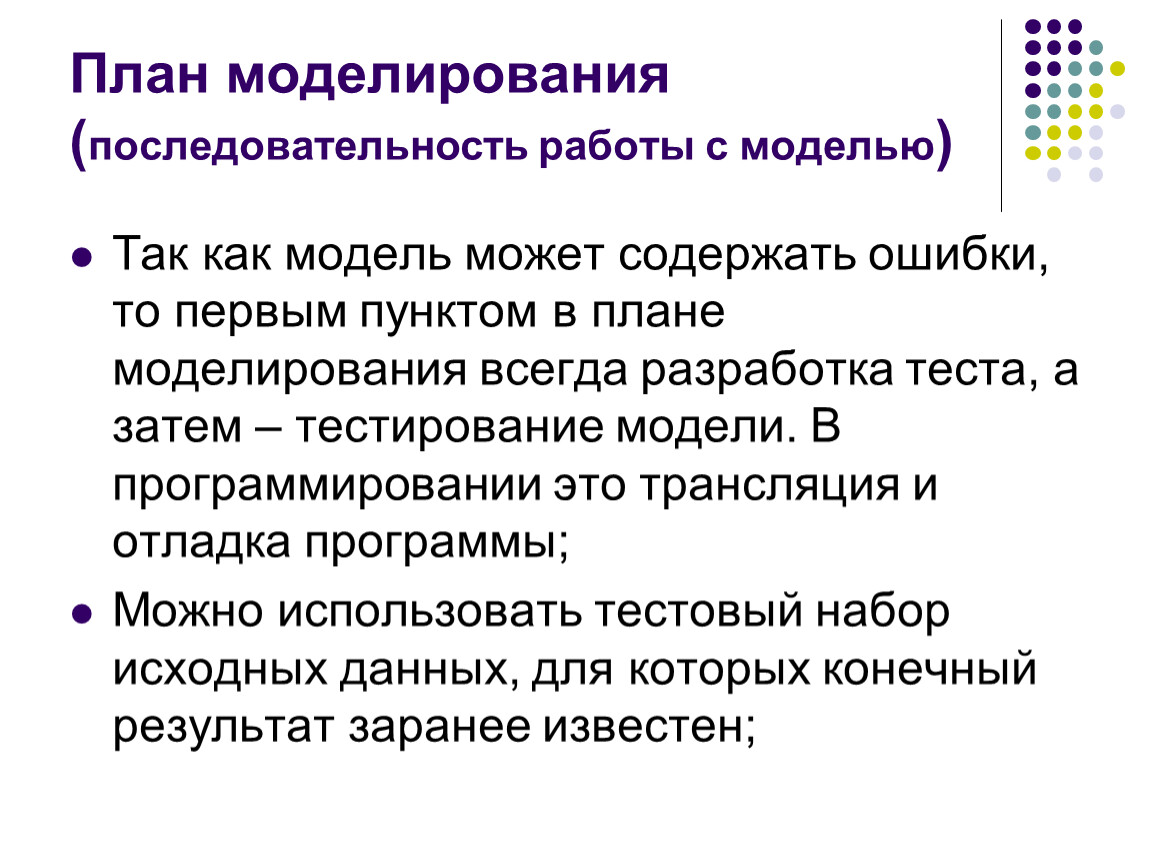 Так как модель может содержать ошибки, то первым пунктом в плане моделирования всегда разработка теста, а затем – тестирование модели. В программировании это трансляция и отладка программы;