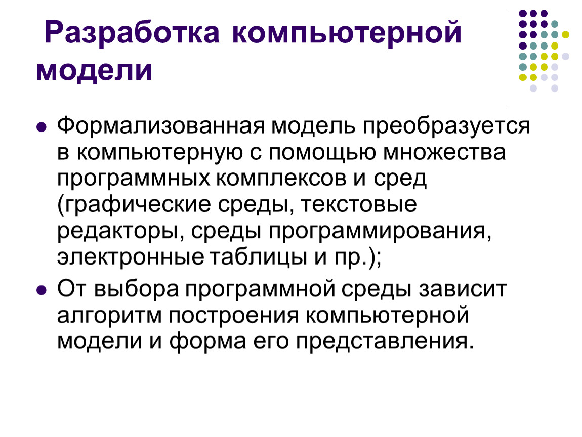 Формализованная модель преобразуется в компьютерную с помощью множества программных комплексов и сред (графические среды, текстовые редакторы, среды программирования, электронные таблицы и пр.);