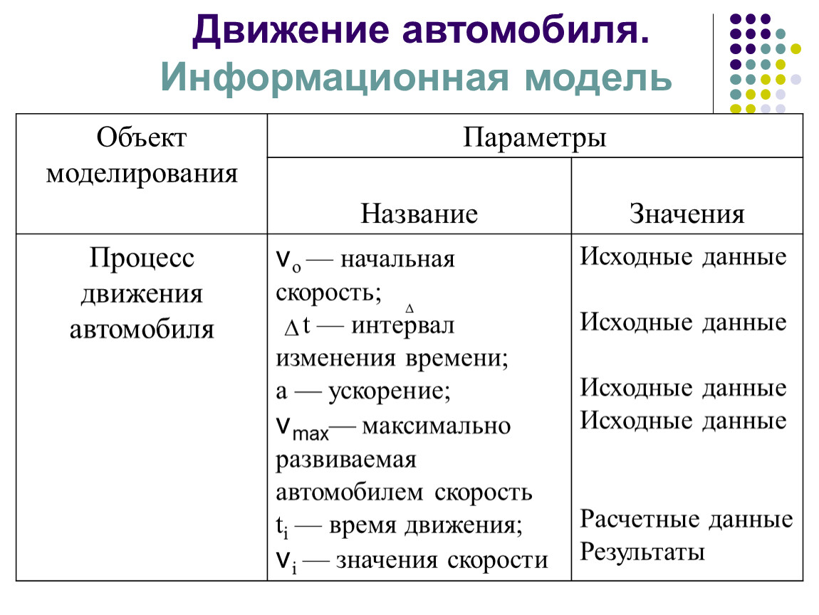 Процесс движения автомобиля | vo — начальная скорость; | Исходные данные |