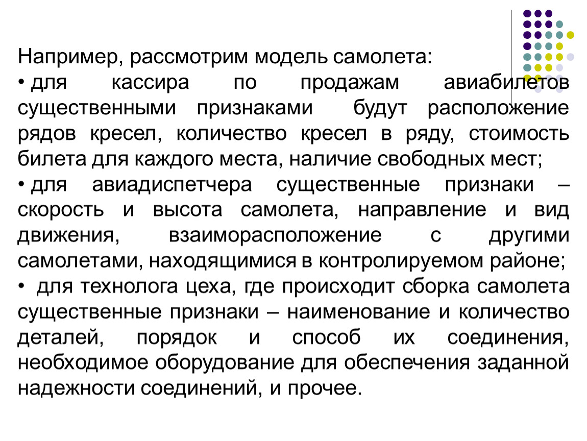 для авиадиспетчера существенные признаки – скорость и высота самолета, направление и вид движения, взаиморасположение с другими самолетами, находящимися в контролируемом районе;