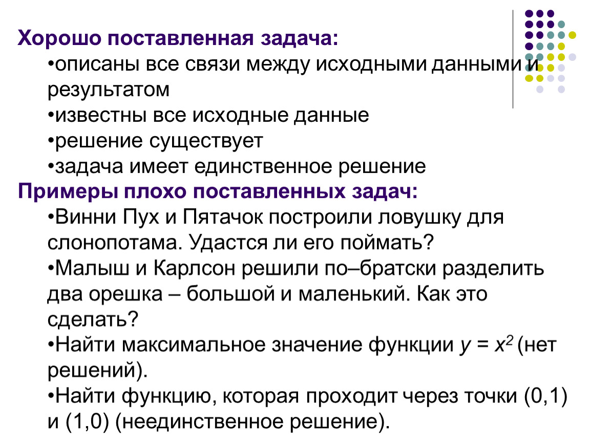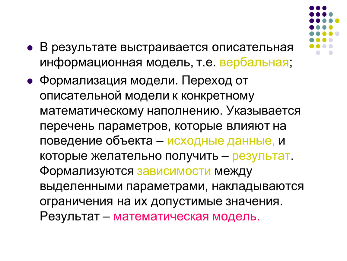 Формализация модели. Переход от описательной модели к конкретному математическому наполнению. Указывается перечень параметров, которые влияют на поведение объекта – исходные данные, и которые желательно получить – результат. Формализуются зависимости между выделенными параметрами, накладываются ограничения на их допустимые значения. Результат – математическая модель.