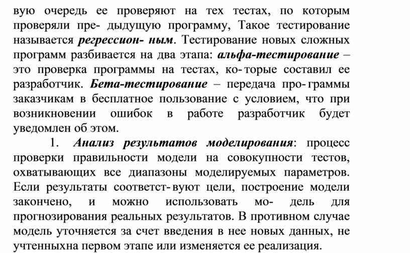 вую очередь ее проверяют на тех тестах, по которым проверяли пре- дыдущую программу, Такое тестирование называется регрессион- ным. Тестирование новых сложных программ разбивается на два этапа: альфа-тестирование – это проверка программы на тестах, ко- торые составил ее разработчик. Бета-тестирование – передача про- граммы заказчикам в бесплатное пользование с условием, что при возникновении ошибок в работе разработчик будет уведомлен об этом.