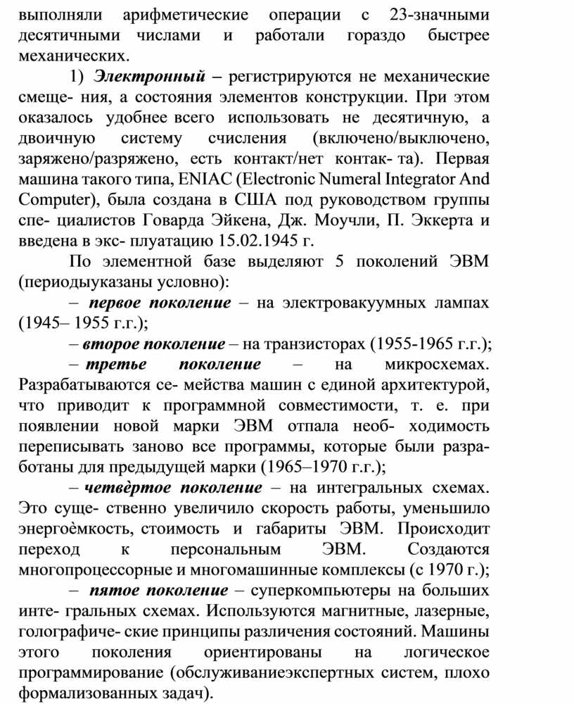 3) Электронный – регистрируются не механические смеще- ния, а состояния элементов конструкции. При этом оказалось удобнее всего использовать не десятичную, а двоичную систему счисления (включено/выключено, заряжено/разряжено, есть контакт/нет контак- та). Первая машина такого типа, ENIAC (Electronic Numeral Integrator And Computer), была создана в США под руководством группы спе- циалистов Говарда Эйкена, Дж. Моучли, П. Эккерта и введена в экс- плуатацию 15.02.1945 г.