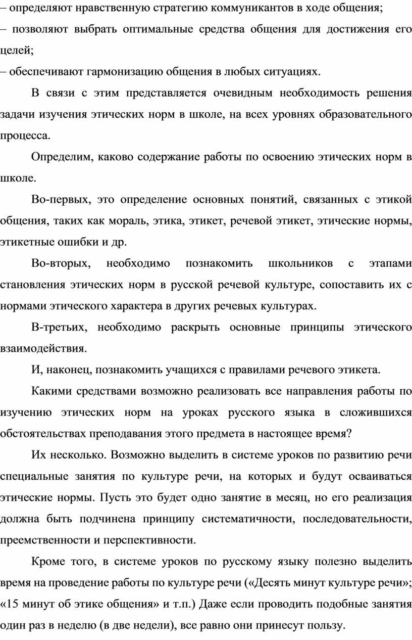 Таким образом, учащиеся средней школы фактически не получают необходимых знаний о системе этических норм, их роли в общении, во взаимодействии коммуникантов, и, следовательно, их коммуникативно-речевые умения, связанные с этикой общения, не формируются, не совершенствуются.