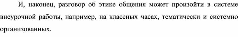 И, наконец, разговор об этике общения может произойти в системе внеурочной работы, например, на классных часах, тематически и системно организованных.