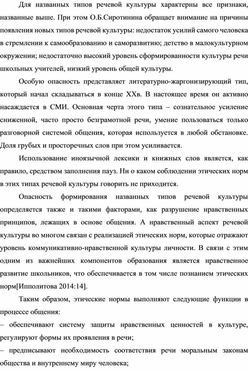 Опасность формирования названных типов речевой культуры определяется также и такими факторами, как разрушение нравственных принципов, лежащих в основе общения. А нравственный аспект речевой культуры во многом связан с реализацией этических норм, которые отражают уровень коммуникативно-нравственной культуры личности. В связи с этим одним из важнейших компонентов образования является нравственное развитие школьников, что обеспечивается в том числе познанием этических норм[Ипполитова 2014:14].