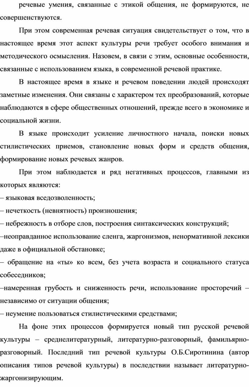 Для названных типов речевой культуры характерны все признаки, названные выше. При этом О.Б.Сиротинина обращает внимание на причины появления новых типов речевой культуры: недостаток усилий самого человека в стремлении к самообразованию и саморазвитию; детство в малокультурном окружении; недостаточно высокий уровень сформированности культуры речи школьных учителей, низкий уровень общей культуры.