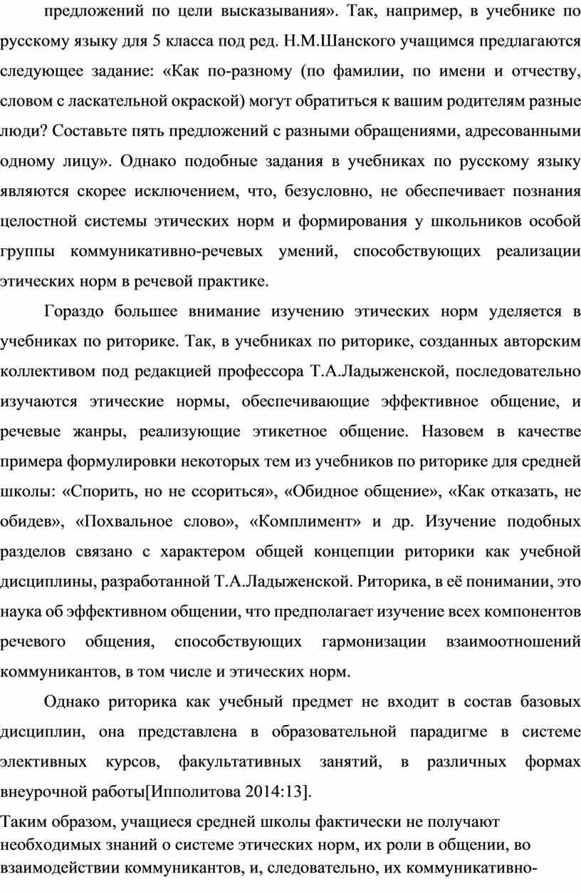 Однако, как представляется, именно этому направлению при изучении курса русского языка уделяется недостаточное внимание, о чем свидетельствует прежде всего уровень речевой культуры современного школьника. Отметим также, что в действующих учебниках, как правило, не представлены специальные разделы, посвященные изучению этических норм. Исключение составляют обращение к этому аспекту речевой культуры при изучении таких тем, как «Наклонение глагола», «Обращение», «Виды предложений по цели высказывания». Так, например, в учебнике по русскому языку для 5 класса под ред. Н.М.Шанского учащимся предлагаются следующее задание: «Как по-разному (по фамилии, по имени и отчеству, словом с ласкательной окраской) могут обратиться к вашим родителям разные люди? Составьте пять предложений с разными обращениями, адресованными одному лицу». Однако подобные задания в учебниках по русскому языку являются скорее исключением, что, безусловно, не обеспечивает познания целостной системы этических норм и формирования у школьников особой группы коммуникативно-речевых умений, способствующих реализации этических норм в речевой практике.