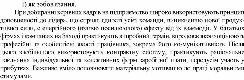 При добиранні керівних кадрів на підприємство широко використовують принцип доповненості до лідера, що сприяє єдності усієї команди, виникненню нової продуктивної сили, с енергійного (взаємо посилюючого) ефекту від їх взаємодії. У багатьох фірмах і компаніях на Заході практикують випробний термін, впродовж якого оцінюють професійні та особистісні якості працівника, зокрема його ко-мунікативність. Після цього здебільшого використовують контрактну систему, практикують раціональне поєднання індивідуальної та колективних форм заробітної плати, передусім участь у прибутках. Важливо вміло доповнювати матеріальну мотивацію до праці моральними стимулами.