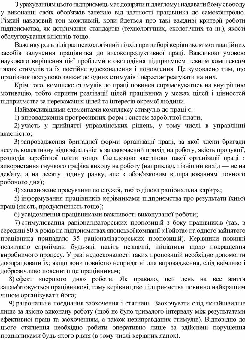 Крім того, комплекс стимулів до праці повинен спрямовуватись на внутрішню мотивацію, тобто сприяти реалізації цілей працівника у межах цілей і цінностей підприємства за переважання цілей та інтересів окремої людини.