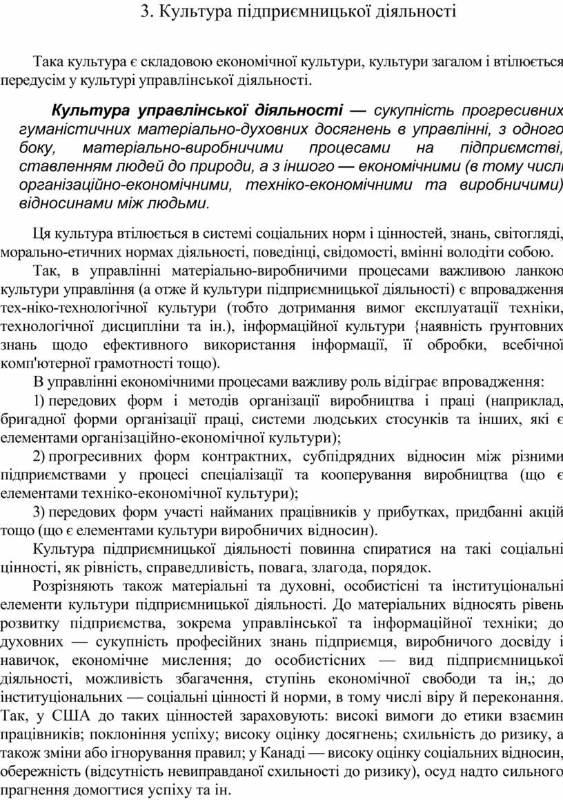 Так, в управлінні матеріально-виробничими процесами важливою ланкою культури управління (а отже й культури підприємницької діяльності) є впровадження тех-ніко-технологічної культури (тобто дотримання вимог експлуатації техніки, технологічної дисципліни та ін.), інформаційної культури {наявність ґрунтовних знань щодо ефективного використання інформації, її обробки, всебічної комп'ютерної грамотності тощо).